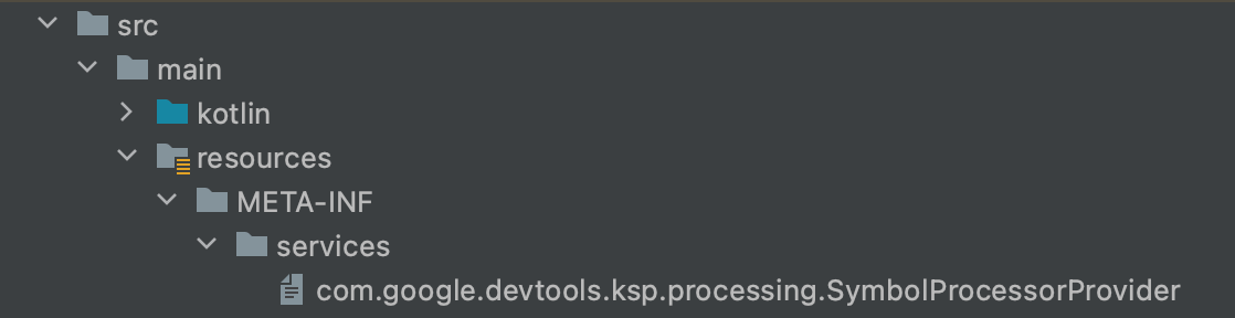 This was the last class that we needed to implement. The last step that we need to execute is to define how this service is going to be loaded during compilation. To achieve that, we have to create the src/main/resources/META-INF/services/com.google.devtools.ksp.processing.SymbolProcessorProvider file (this should happen in the processor's Gradle module).