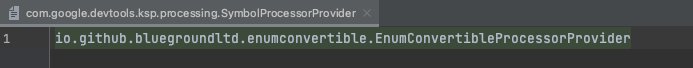 After creating the com.google.devtools.ksp.processing.SymbolProcessorProvider file, we need to write the fully-qualified name of the created SymbolProcessorProvider in it. The content of the file should look like that: